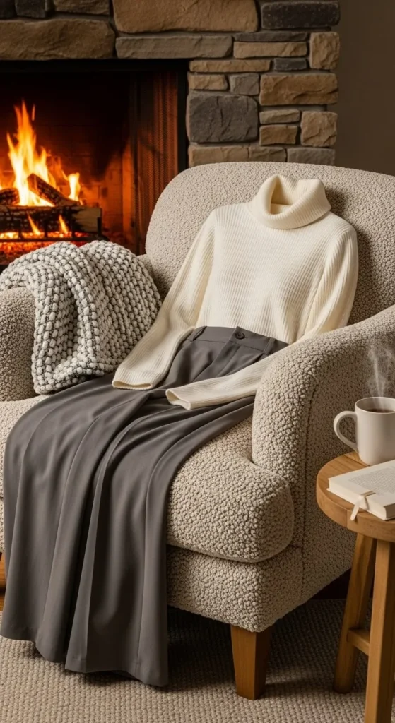 If you want to stay warm while keeping your look elegant, a turtleneck sweater with wide-legged pants is a simple yet stylish combination. Add a statement belt and slip-on shoes to complete the ensemble. This outfit is great for holiday dinners where you want to feel both festive and comfortable. Choose soft, stretchy fabrics that allow for easy movement and comfort all day long.