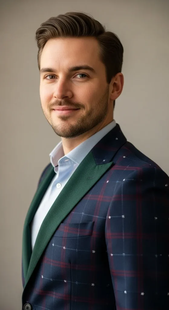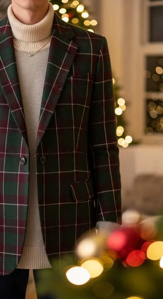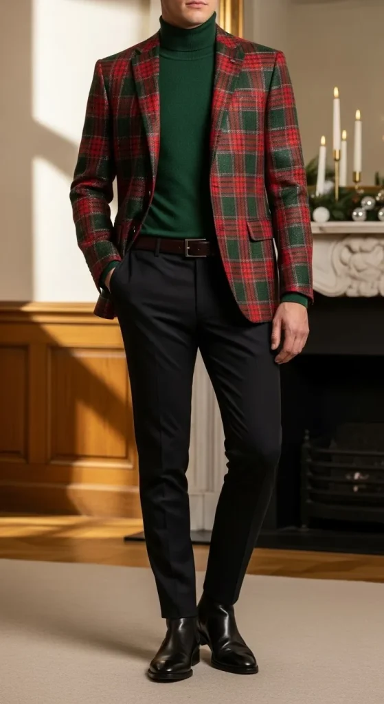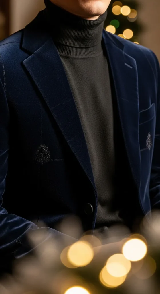 A navy blazer always looks clean and modern. Pair it with a black turtleneck for a smooth, winter-ready look. Keep trousers slim so the outfit stays sharp. You don’t need expensive knits—any soft black turtleneck works. Add a simple watch and dark loafers. If you want a small touch of holiday style, pick a pocket square with a hint of silver. Re-use the same turtleneck with other jackets to save money. A lint roller and a quick steam can make the whole outfit look freshly styled without paying for tailoring.