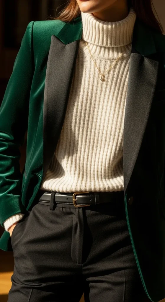 Ribbed knits add texture and warmth. Choose slimmer knits so the blazer still fits smoothly. Stick to neutral colors that work with multiple outfits. Pair with trousers or fitted denim. Affordable ribbed knits are easy to find and last beyond the holidays. This outfit works well for both indoor and outdoor events.