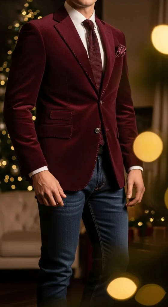 A burgundy blazer feels festive while staying classy. Dark denim keeps the outfit grounded and practical. Choose a black or charcoal tee underneath. This outfit works well for after-work events or casual evenings. If the blazer feels bold, choose a deeper burgundy tone. Steam the blazer for smooth sleeves and clean shoulders. This look is great for photos and doesn’t require new accessories.