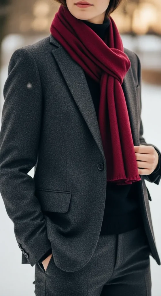 A charcoal blazer works with almost anything, but a burgundy scarf adds seasonal color without looking loud. Stick to a lightweight scarf so the neckline doesn’t look bulky. You can re-wear the scarf with casual outfits all winter. Pair this with black trousers or dark denim. Add boots for a grounded look. Repeat pieces you already own—the scarf is the only extra you need to buy. This combo feels warm and ready for photos without looking overly styled.