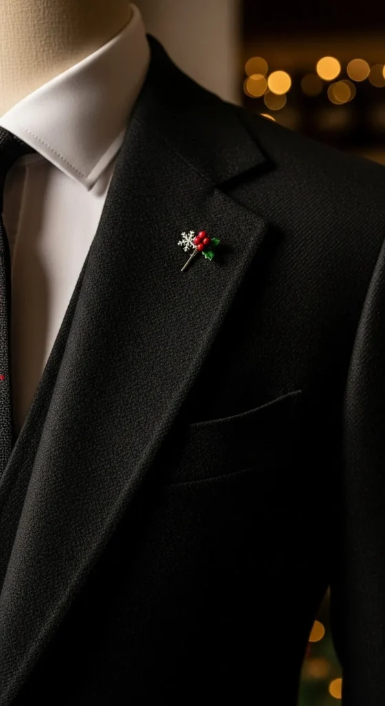 A lapel pin adds personality without going overboard. Keep it tiny and clean—snowflake, star, or leaf. Wear a black blazer with a crisp shirt or tee. This is a great option if you prefer minimal styling. Pins are cheap, reusable, and easy to store. Avoid oversized pins—they distract from the blazer shape. This works perfectly for office events where subtle style goes a long way.
