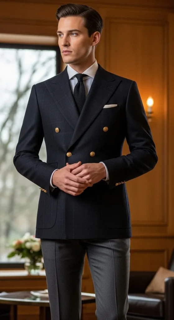 Double-breasted blazers look sharp without trying. They work best with slim or straight trousers, not wide ones. Keep your shirt plain so the structure of the jacket stays the main detail. You don’t need high-priced tailoring—just check shoulder fit. Add a simple belt and dark shoes. This outfit looks polished even if you’re heading straight from work to an event. Great for formal holiday dinners or corporate functions.