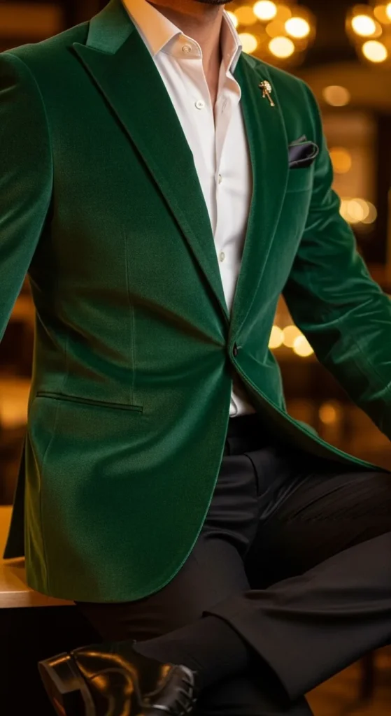 A velvet blazer instantly feels evening-ready. Pick deep colors like black, navy, or wine. Keep the base outfit simple—plain tee or clean button-up. Velvet catches light, so avoid heavy accessories. If you’re working on a tight budget, you can find velvet blazers in thrift stores or rental shops. Wear with black trousers and polished shoes. Skip bold prints; let the jacket handle the styling. This is perfect for dinners, parties, or end-of-year events.