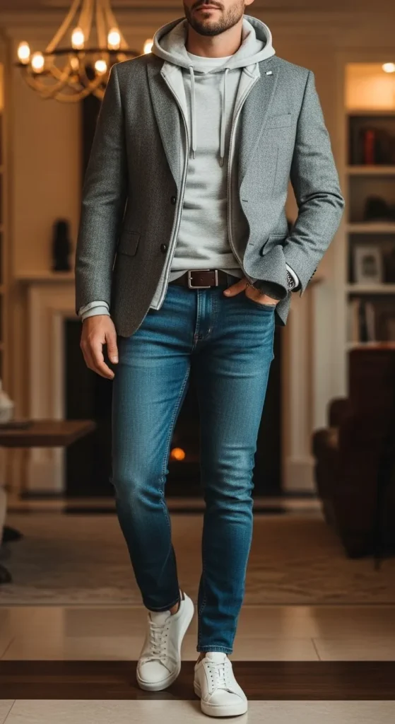 A hoodie under a blazer feels modern and comfortable. Choose thin hoodies so the blazer still fits well. Grey on grey works especially well. This outfit is great for casual Fridays, coworking meetups, or relaxed holiday gatherings. You don’t need fancy sneakers—clean ones work. This combo gives you warmth without feeling too formal. Stick to neutral colors so the look stays sharp.