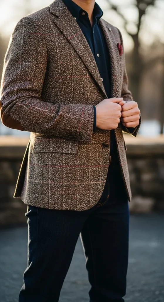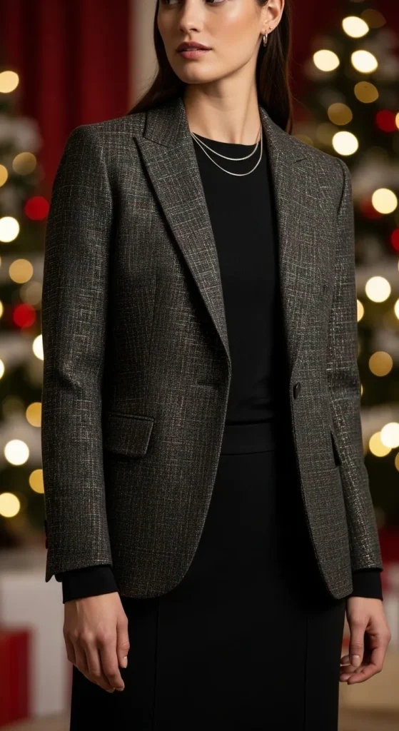 Tweed adds texture that feels right for the season. Dark denim keeps the look smart but relaxed. Choose a simple knit or tee underneath. If your blazer looks bulky, pair it with slimmer trousers so the proportions stay clean. You don’t need designer tweed—affordable versions from high-street stores look great when steamed. Add brown boots for a grounded finish. This outfit works well for casual holiday gatherings and after-work events.