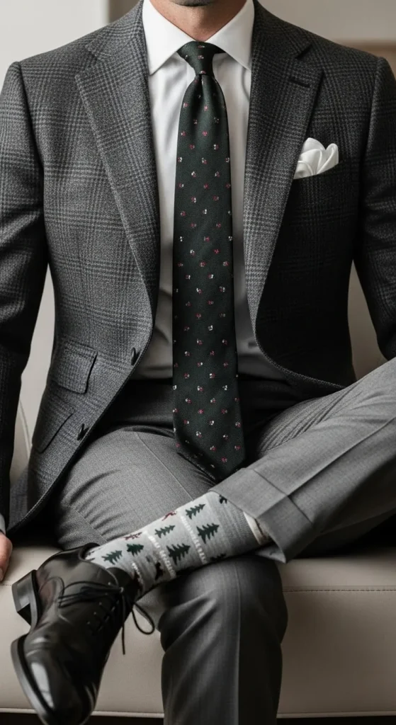 If you want holiday energy without full commitment, try fun socks. Use a beige or grey blazer and keep the outfit neutral. Let the socks add personality. This works well for office settings where you want to keep things polished. You can buy affordable multi-packs and switch patterns through the season. Avoid loud colors near the blazer; let the socks be the only playful detail. This is an easy outfit upgrade with almost no cost.
