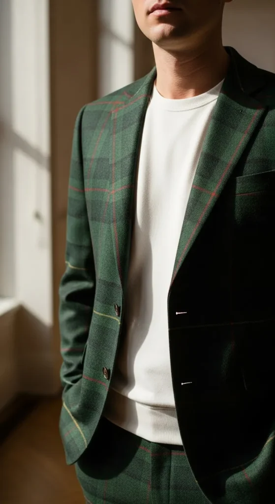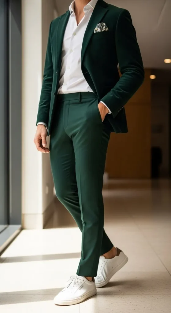 An emerald blazer feels seasonal without being flashy. Keep the rest of the outfit neutral—black, white, or grey. Stick to one subtle accessory like a thin chain or a clean watch. If emerald feels bold, pick a muted green instead. You can wear the same trousers you already have. This is an easy way to add color without spending much. Steam the blazer so the shape looks sharp, especially around the shoulders.