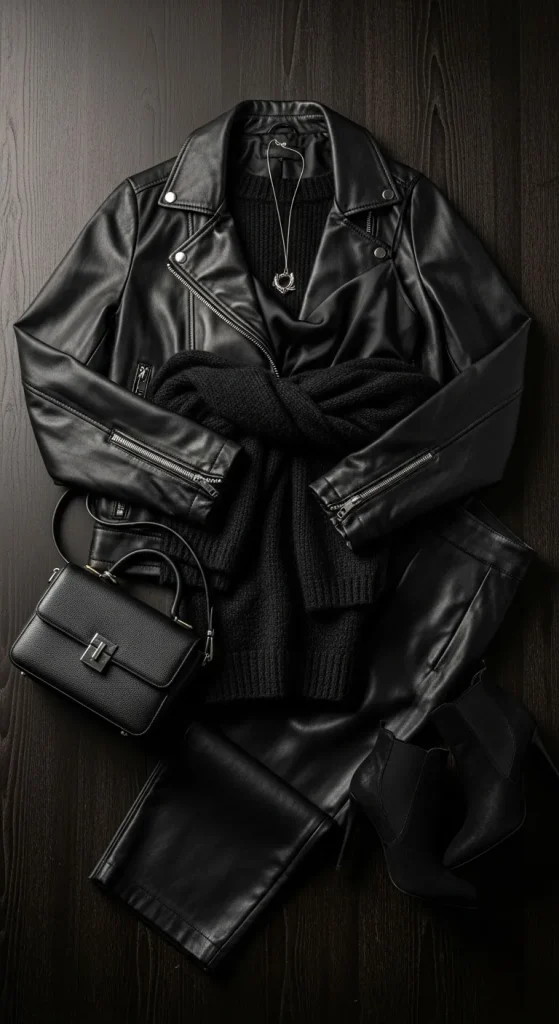 All-black outfits work well when you mix textures like leather, satin, and knit. You can use pieces you already have. Add small gold jewelry for warmth. Layer a coat if needed. You can even add satin ribbons to buttonholes or pockets for an easy DIY detail.