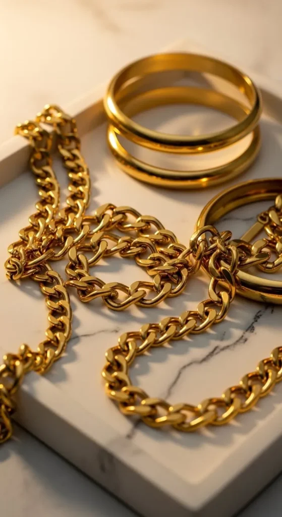Chunky gold pieces add warmth to simple outfits like black dresses, white tops, or plain jumpsuits. Stick to one or two large pieces so the look stays clean. If you’re on a budget, choose gold-tone items that still look polished. You can polish older jewelry with a soft cloth and mild soap for a new shine.
