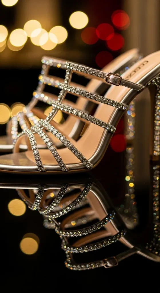 Crystal straps add shine without being too bold. Pair them with simple outfits like black dresses or satin skirts. You can glue rhinestones onto old straps for a DIY version. Keep accessories small. These shoes work well for both casual and dressy events.
