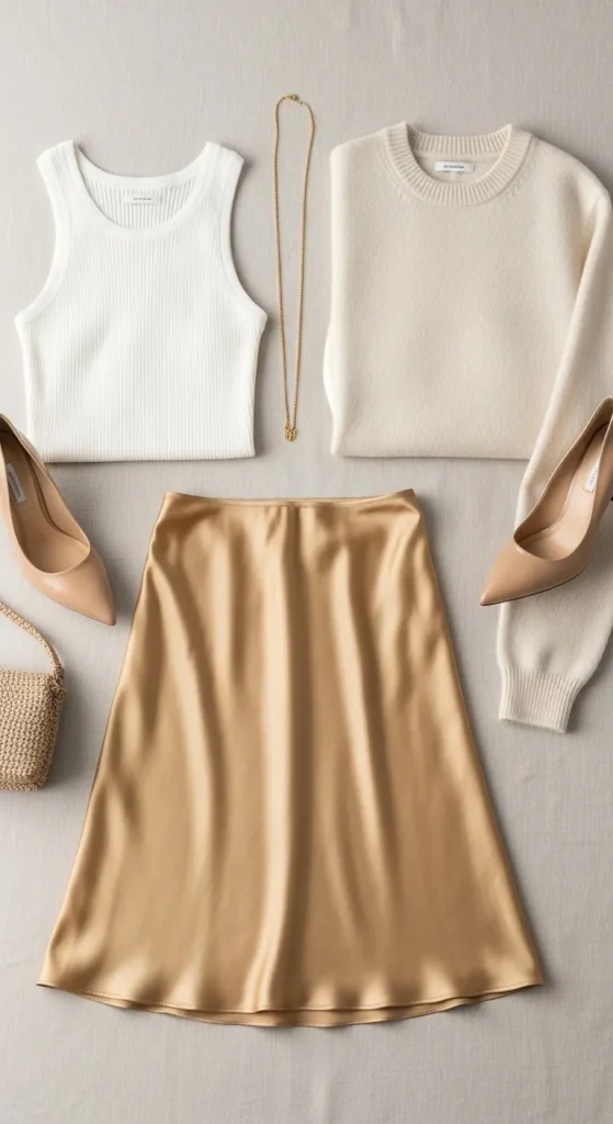 Gold skirts pair well with neutrals like black, cream, and beige. Choose a satin or silk-look fabric. You can thrift a slip dress and cut it into a skirt if you want a low-cost option. Wear it with sweaters, tanks, or simple fitted tops. A pair of minimal heels completes the look.