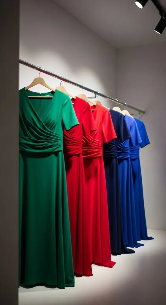 Deep colours like emerald, ruby, and sapphire feel right for holiday events. Choose simple shapes like slip dresses or wrap dresses. You can find jewel-tone satin or velvet at budget stores. If you want a small DIY upgrade, sew a thin ribbon along the neckline for charm. Add heels or boots depending on the weather.