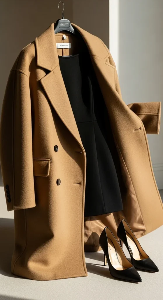 Wearing a long coat over a mini dress creates a clean, tall shape. Choose coats in camel, black, or grey. Budget-friendly wool blends work well. You can refresh an old coat with new buttons or a stitched hem. Add tights if it’s cold. Keep accessories small so the coat stands out.
