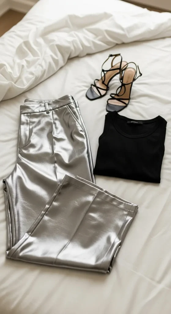 Metallic pants add shine without feeling too bold. You can pair them with plain tops you already own—black, white, or nude work well. Keep accessories minimal. If you want a low-cost option, look for metallic fabric and sew simple elastic-waist trousers at home. Wide-leg shapes make outfits look balanced and comfortable. Add a blazer for dinners or switch to a cropped jacket for parties.