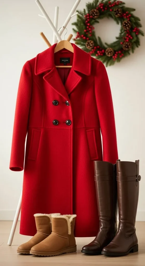 A red coat adds colour to winter outfits without changing your wardrobe much. Wear it over black, grey, cream, or denim. You can thrift a red coat for less and update the buttons yourself for a cleaner look. Add a scarf in soft neutrals and simple makeup. This style works for brunches, dinners, and casual gatherings.