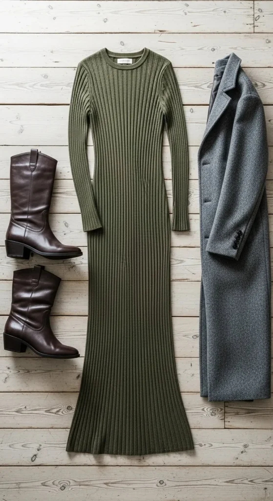Ribbed maxi dresses are comfortable and flattering. Add a belt for shape or layer with a blazer. You can find ribbed fabric cheaply if you want to sew one at home. Choose neutral colours for easy pairing. Add boots or heels depending on the occasion.