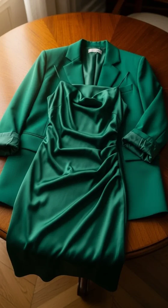 Satin dresses bring soft shine to holiday dinners. Layer an oversized blazer on top for balance. This mix works well when you want something dressy but still relaxed. Add block heels or pointed flats. If you’re saving money, pick a satin slip from a discount store and pair it with a blazer you already own. A thin chain necklace completes the look without overdoing it.