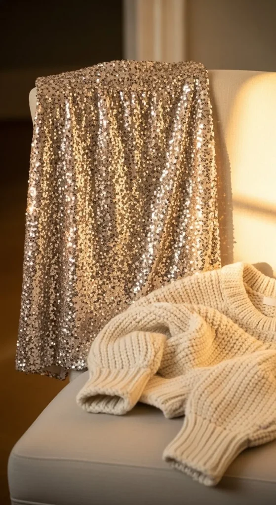 Pair a sequin skirt with a soft knit top for a holiday look that feels warm and polished at the same time. Stick to simple silhouettes so the sparkle stays the main focus. If you’re on a budget, grab a basic knit sweater you already own and tuck it lightly into the waistband. Add simple hoops, a clutch, and ankle boots. You can even stitch a few loose sequins onto an older skirt to give it a new shine. Keep the colours clean and let textures do the talking.