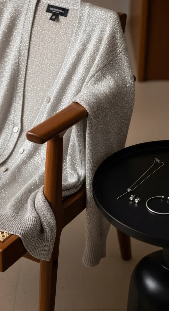 Metallic-thread cardigans add subtle shine to jeans, skirts, or dresses. If you want a DIY version, sew tiny rhinestones along the buttons or cuffs. Stick to neutral colours to keep the shimmer soft. Wear it open or buttoned depending on the event. Add delicate earrings for a simple finish.