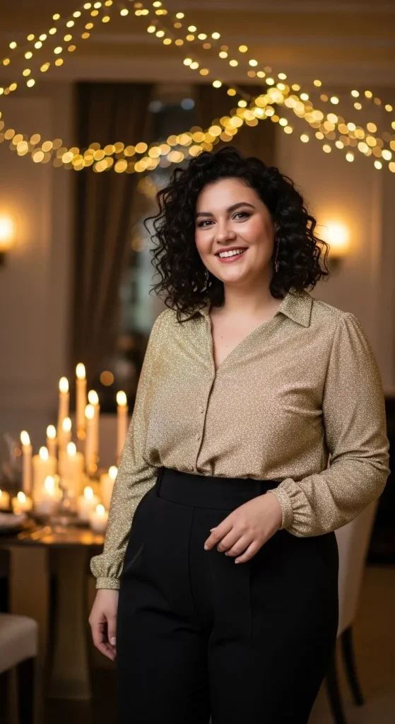 A glitter blouse adds sparkle without feeling overdone. Pair with wide-leg trousers or black jeans for a polished yet comfy outfit. If you’re crafty, add sequined trim to an old blouse for a similar shine.