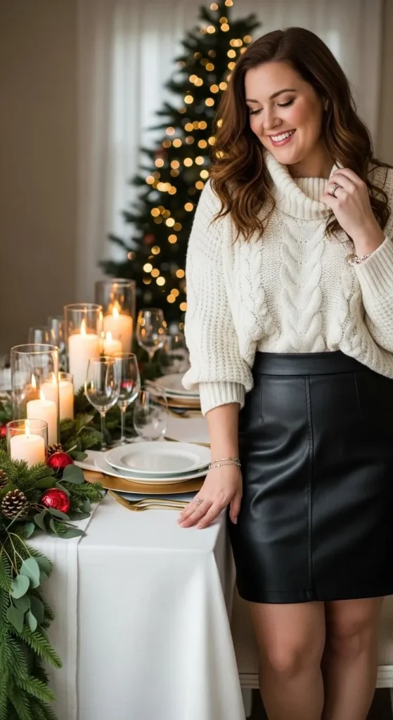 Mix textures for balance. A leather skirt gives structure, while a chunky sweater adds softness. Tuck in your sweater slightly for shape and finish with boots. You can thrift both pieces easily and still look runway-ready.