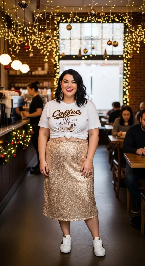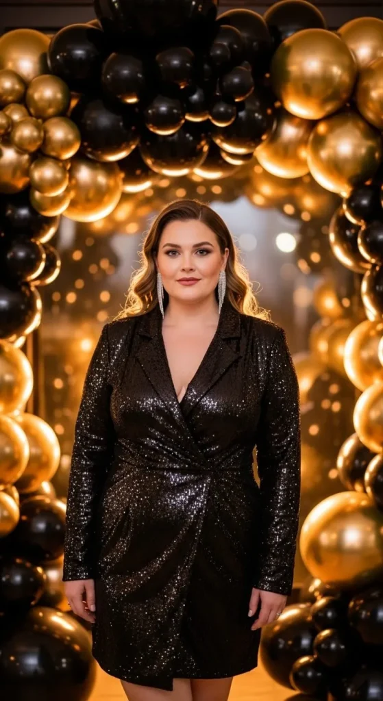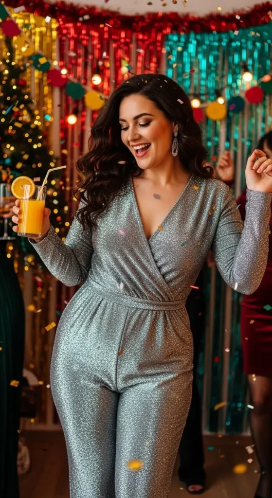 A wrap dress works wonders for curves, and sequins make it party-perfect. Go for gold, rose, or deep emerald tones for a festive vibe. Add strappy heels and statement earrings for a glam look. If you want a softer effect, drape a neutral shawl around your shoulders. For a budget-friendly option, grab a thrifted sequin dress and tailor the waist for a better fit.