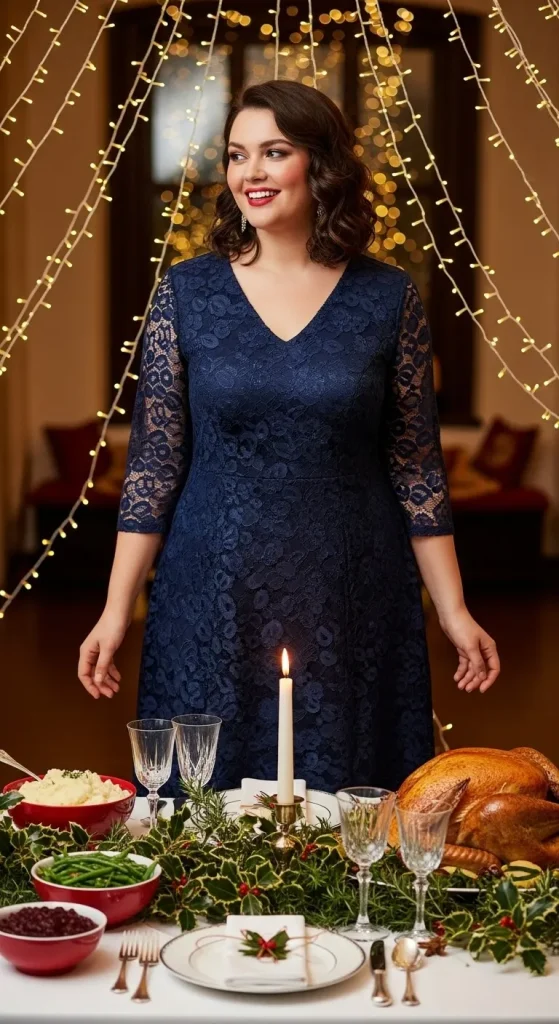 Lace feels festive and timeless. Pick colors like navy, wine, or forest green. Pair with metallic heels and a clutch. Lace dresses are easy to find secondhand—just add a slip underneath for comfort and shape.