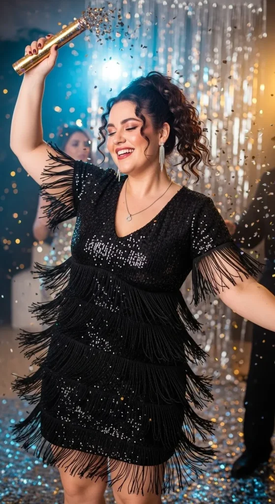 A fringe dress moves beautifully on the dance floor. Choose black, gold, or red for festive energy. Pair with strappy heels and minimal jewelry since the dress already shines. Add a faux fur stole for extra drama.