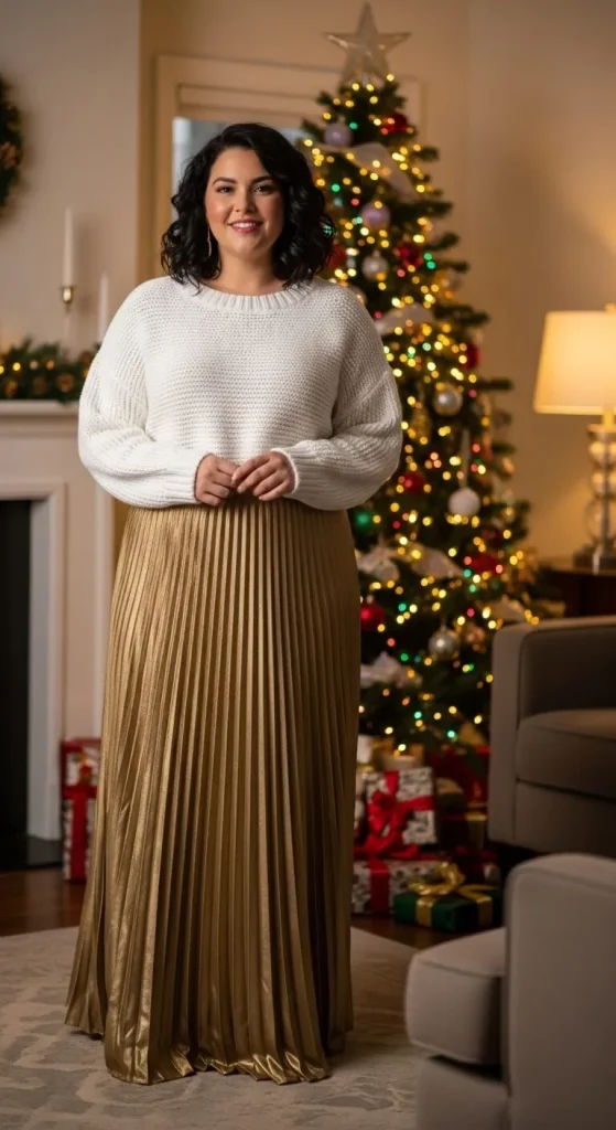 A gold pleated maxi skirt instantly adds shine to any gathering. Pair it with a soft knit sweater for a balanced mix of glam and comfort. Add ankle boots or block heels to keep things practical yet polished. To switch it up, tuck in the sweater slightly and add a waist belt for structure. Want a DIY version? Use metallic fabric and elastic waistband to sew your own pleated skirt—it’s easier than it sounds and way cheaper than store-bought options.