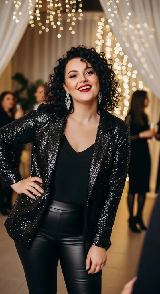 Pairing a statement blazer with leather pants screams confidence. Choose sequins, velvet, or metallic finishes for your blazer. Add a simple tank underneath and heeled boots. For a budget hack, look for thrifted blazers and upgrade them with iron-on gems or rhinestones.