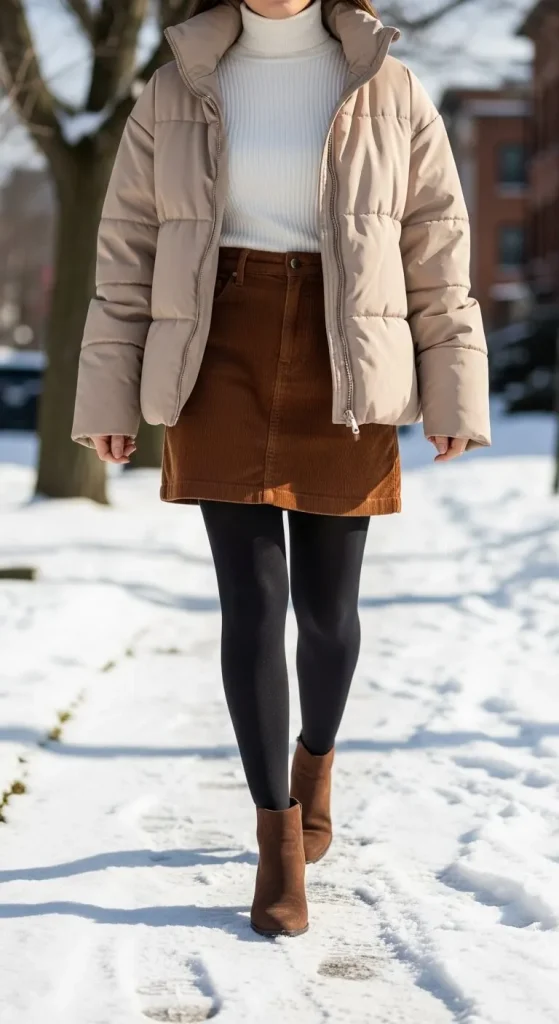 Corduroy feels festive and practical. Combine your corduroy skirt with a turtleneck and short puffer jacket. Choose knee-high boots for insulation. Look for secondhand corduroy options—they’re durable and affordable. Add a scarf in a bright tone to lift the outfit.