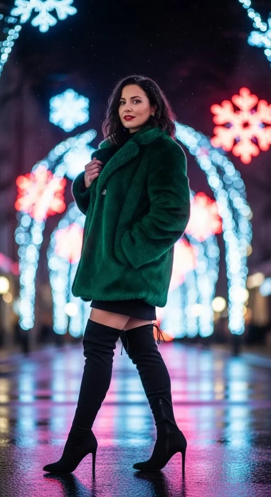 Add glamour with a faux fur jacket and mini skirt. It feels festive but still wearable. Stick to solid colours like black or beige. Pair with tights for warmth. Vintage stores often have beautiful faux fur options at great prices.