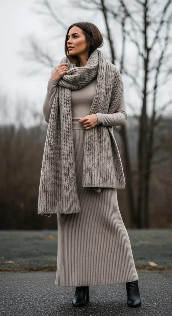 This one’s cozy and elegant. A knit maxi skirt works well with a slim top and large scarf. Add suede boots for texture. It’s a minimal yet stylish look. You can repurpose old knit blankets into skirts if you enjoy DIY sewing.