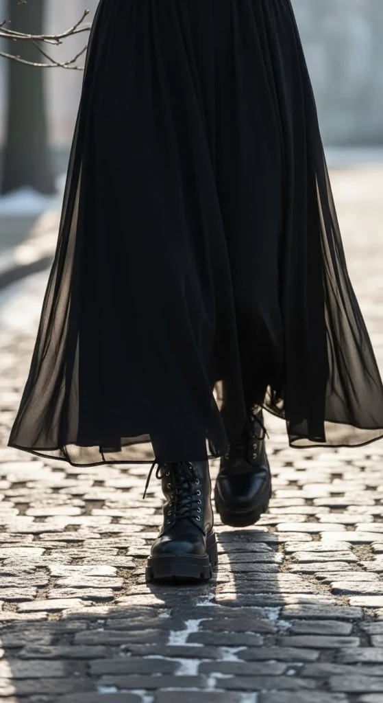 For effortless style, pair a maxi skirt with combat boots and a cropped jumper. The contrast adds interest. Add a scarf and crossbody bag. Thrift flowy skirts—they’re easy to style for winter. Roll up sleeves and tuck slightly for casual comfort.