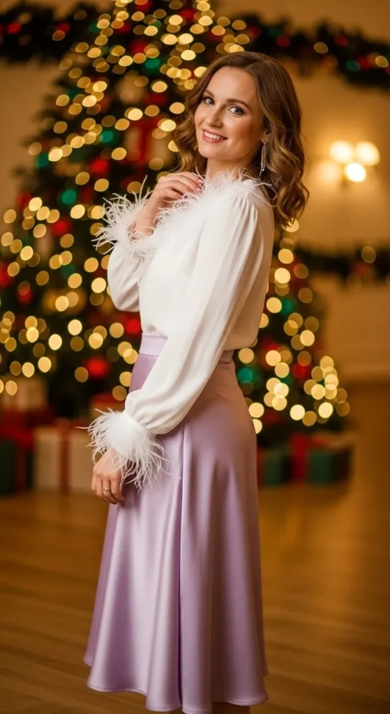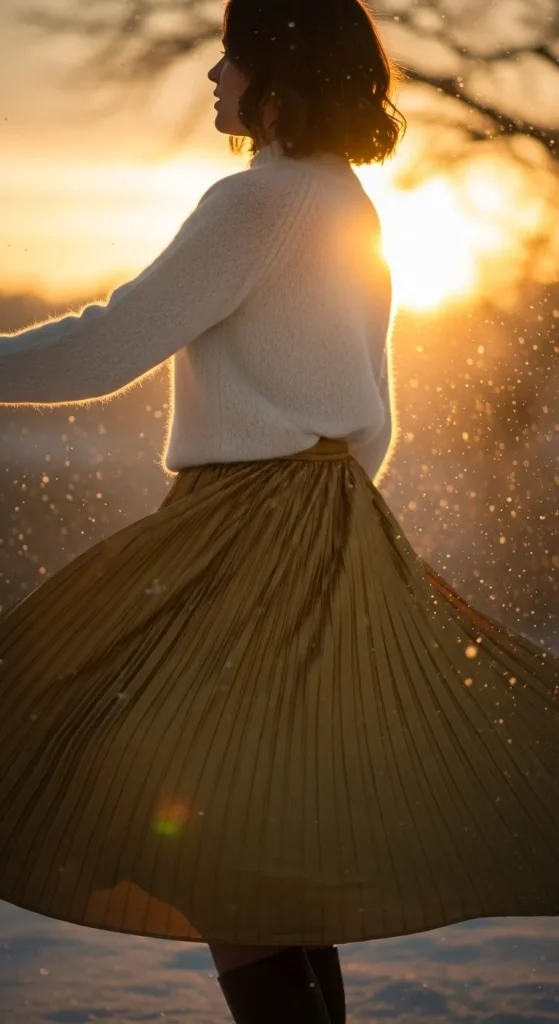 Shimmer meets softness here. The metallic pleated skirt reflects festive lighting beautifully. Pair with a plain jumper to tone it down. For a DIY touch, spray metallic paint lightly over an old pleated skirt. Keep accessories simple—let the shimmer do the talking.