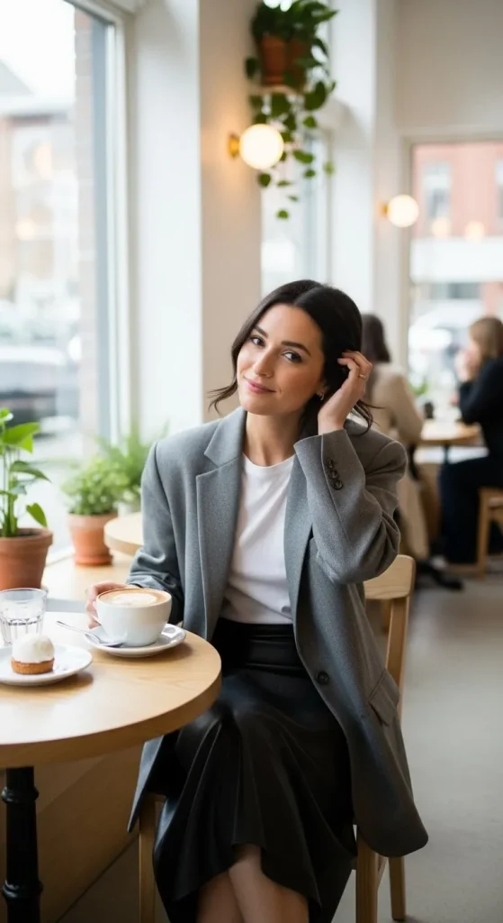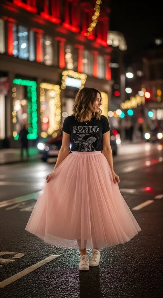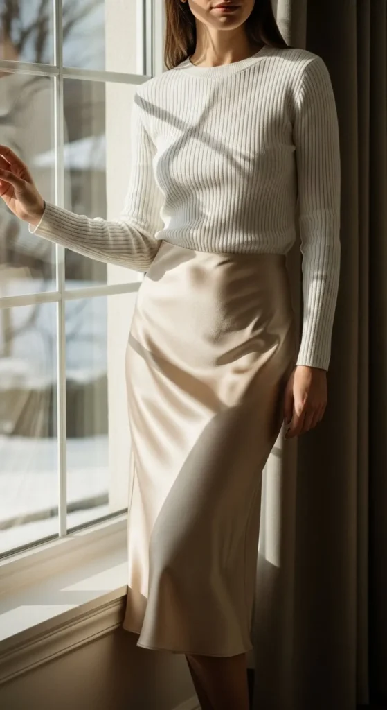 This outfit balances shine and texture. A slip skirt with a snug knit top feels elegant yet easy to wear. Add long boots and a long coat for warmth. If you’re on a budget, thrift satin slips and shorten them. Iron them gently for a polished finish.