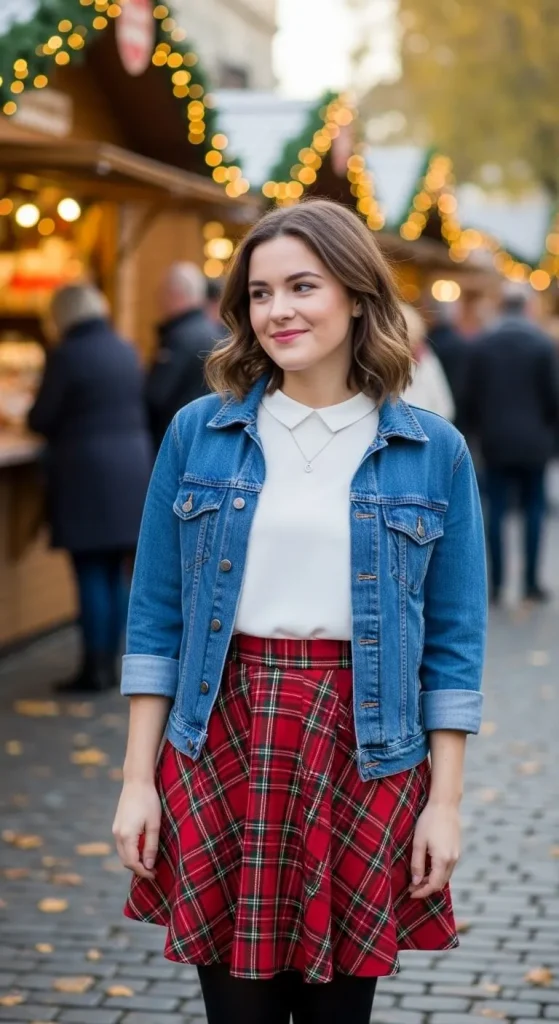 Pair a plaid skirt with a soft turtleneck for timeless holiday charm. Add opaque tights and ankle boots for warmth. A thin belt around the waist creates shape. If you don’t have a turtleneck, use a fitted sweater or a cropped knit. Add small gold hoops and a red lip for that festive touch. Affordable plaid skirts are easy to find at thrift stores or online winter sales.
