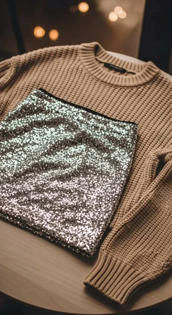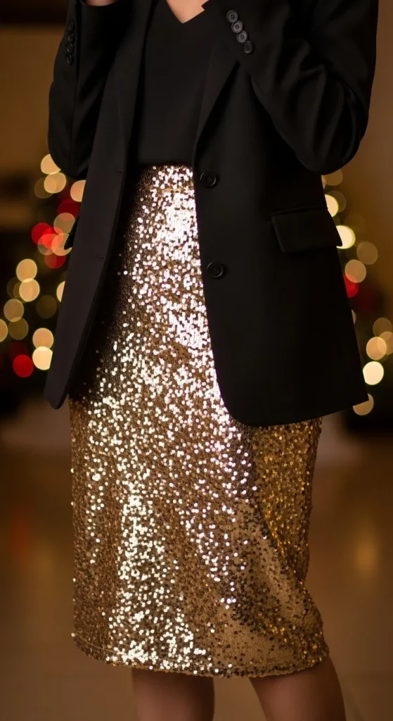 Mix sparkle and softness by wearing a sequin mini skirt with an oversized sweater. It’s stylish yet comfortable for long evenings. Add sheer tights and kitten heels for balance. A budget-friendly option: DIY your own sequin skirt using fabric glue and thrifted sequins. Keep accessories simple since the skirt already stands out.