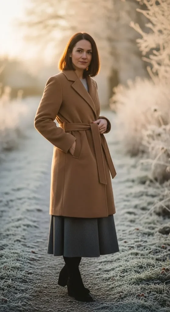 Layering looks refined here. A midi skirt with a belted coat keeps proportions sleek. Add heeled boots. Neutral tones work best. Use your existing coat and cinch with any belt—it instantly looks intentional.