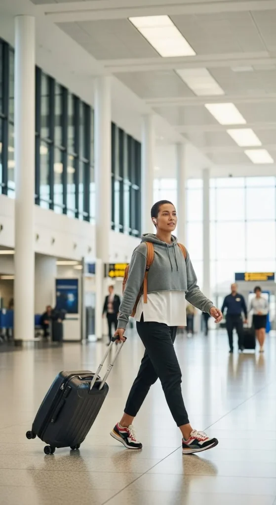 Layers are the secret to surviving unpredictable airport temperatures. Start with a cotton tee, add a cardigan or hoodie, and finish with a lightweight jacket. Choose breathable fabrics like cotton or bamboo for comfort. Stick to a neutral palette for easy mixing. Want to save space? Roll your layers tightly into packing cubes. For a budget touch, repurpose your favourite everyday pieces — a basic hoodie or denim jacket works great.