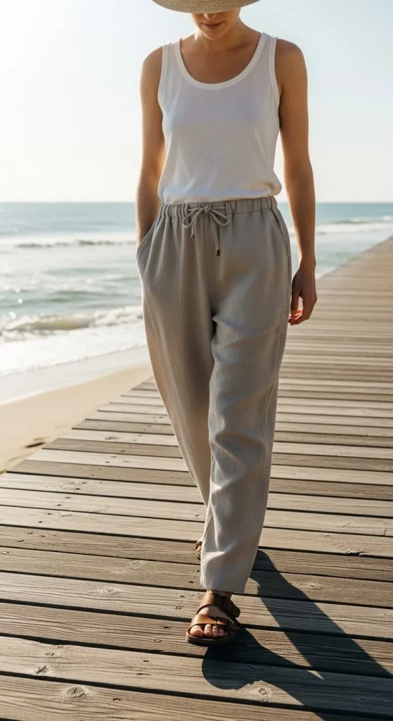 Linen trousers keep you cool and polished. Look for drawstring or elastic styles for long travel days. Pair with a tank top and slip-on sandals. They pack small and dry fast. You can find affordable linen-blend options at summer clearance sales. A straw hat completes the look for resort trips.