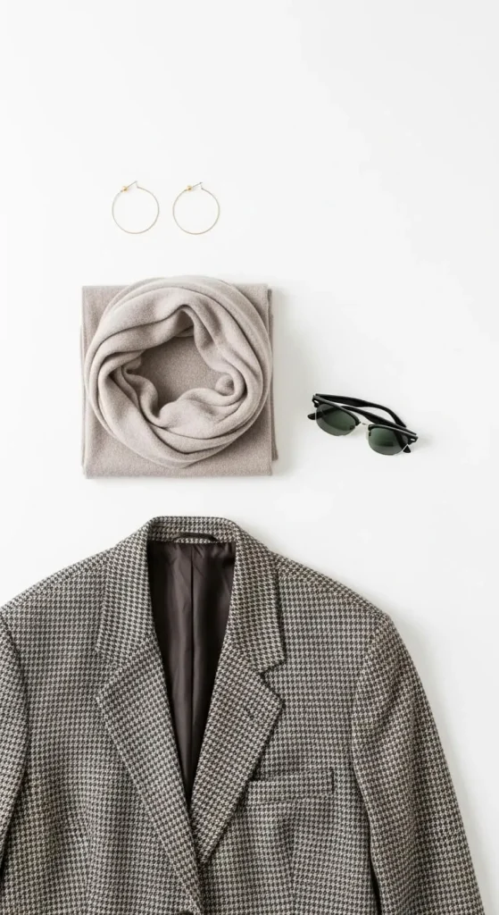 [Image Prompt] A minimalist flat-lay of budget-friendly chic items: gold hoops, a neutral scarf, classic sunglasses, and a thrifted blazer on a white background.