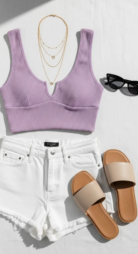 - Lavender crop top + white denim shorts + sandals
