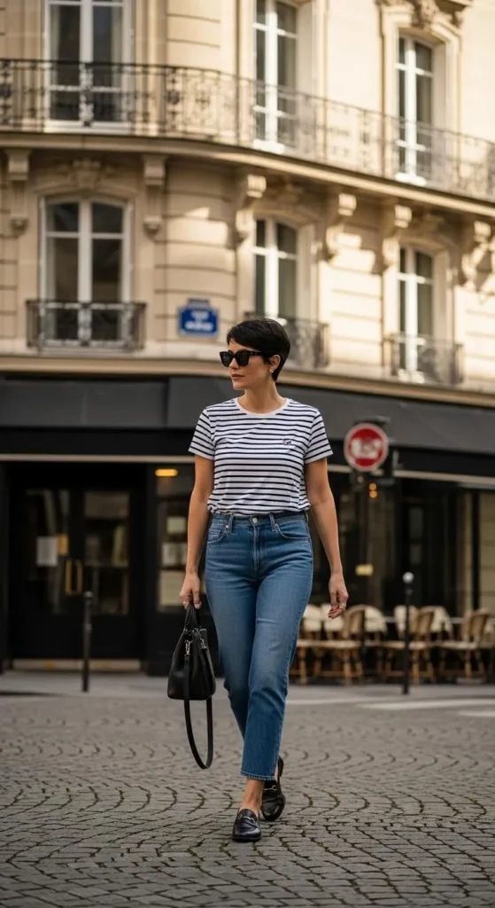 • Striped tee + straight jeans + loafers