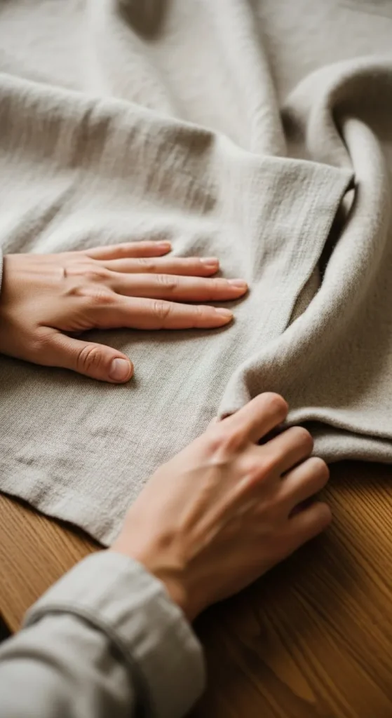 [Image Prompt] A close-up shot of hands feeling soft beige linen and wool fabrics spread across a wooden table.