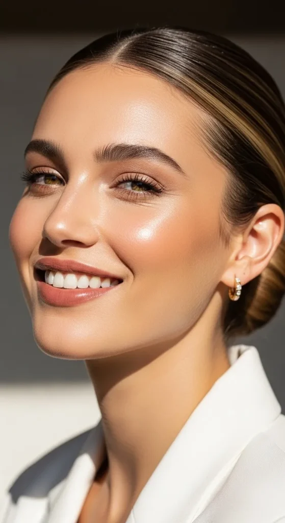 - Focus on glowing skin, neutral tones, and well-shaped brows.
