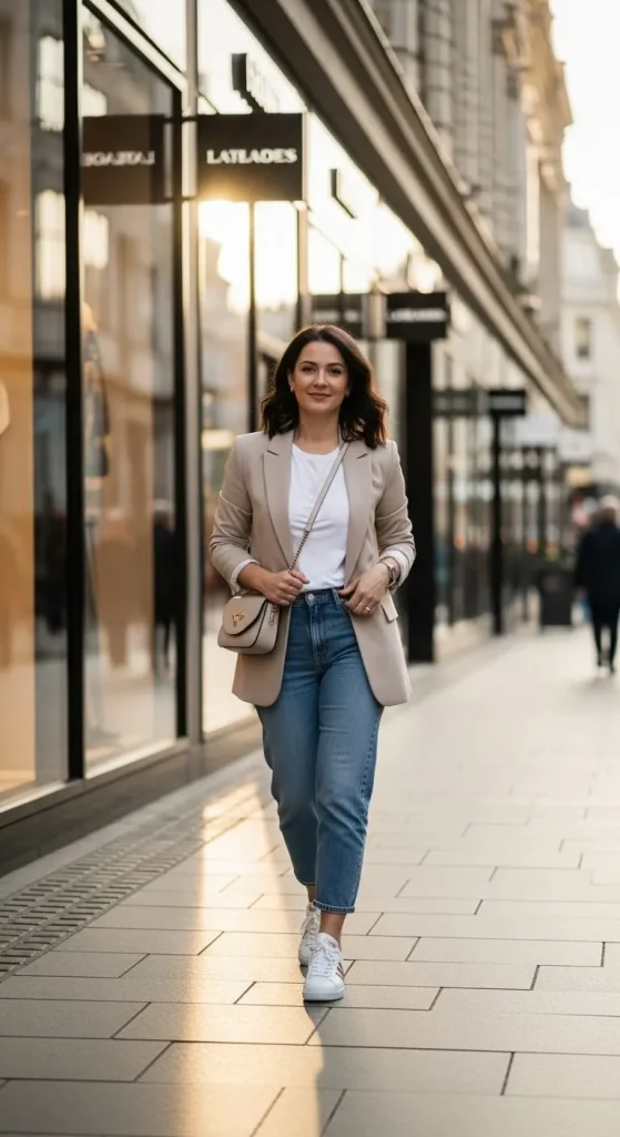 - White sneakers + blazer + jeans = smart casual