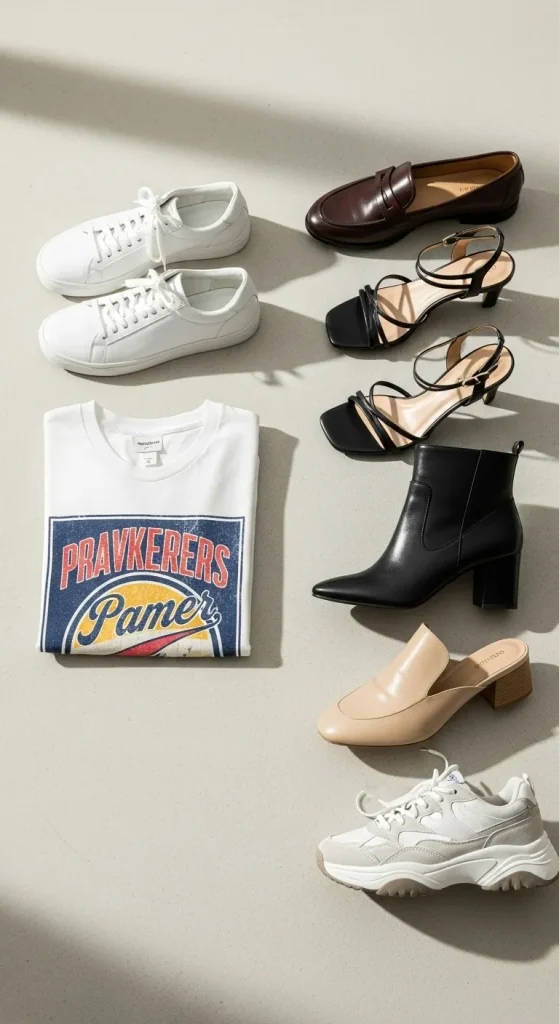 A few accessories help polish the outfit without losing the tee’s relaxed feel.