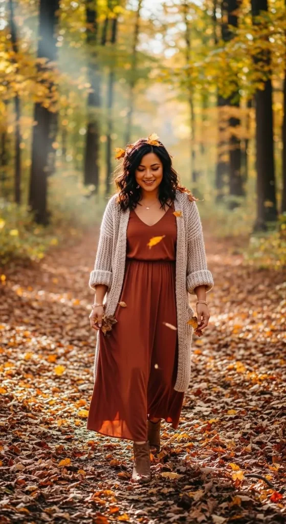 When the leaves start to turn, earthy maxi dresses become your best friend. Warm rusts, deep greens, and golden yellows create that cozy fall energy.
